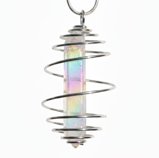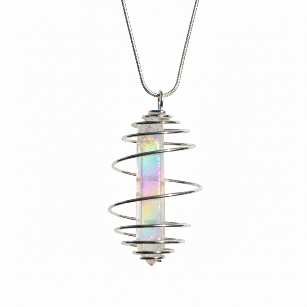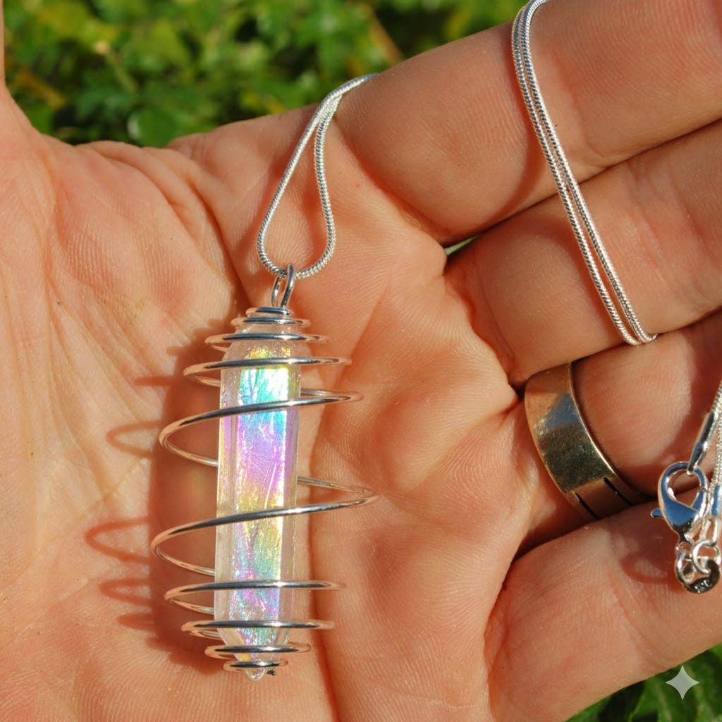 <prompt begin>This image is of an Angel Aura Quartz Crystal Pendant on a snake chain held in the hand of a man. The pendant is made by placing an Angel Aura Crystal inside a 20mm Spiral Bead cage.
